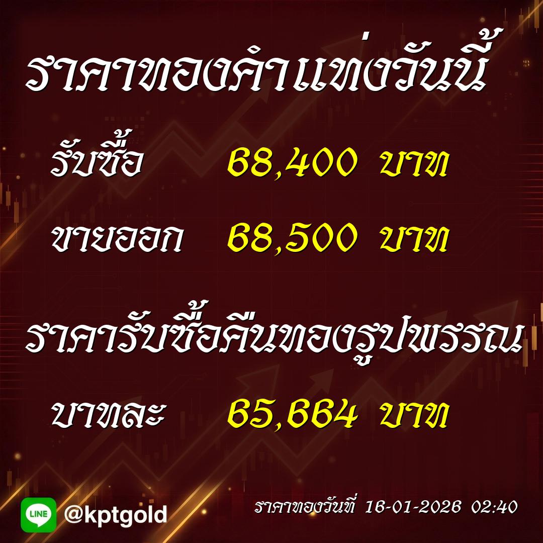 ราคาทองคำแท่ง รับซื้อบาทละ 68,400 บาท ขายออกบาทละ 68,500 บาท ราคารับซื้อคืนทองรูปพรรณบาทละ 65,664 บาท |